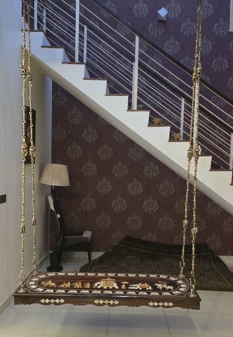 Wooden Swing in Chennai, but this swing is installed @ Malaysia. This is a rosewood Dasara inlay work design with brass antique finish chain link with New elephant toys and special ladies' toys will add to show luxury model brass antique chain with bottom kada (ring), also a special design for my customer and also brass antique finish bearing kada for swing hanging purpose.